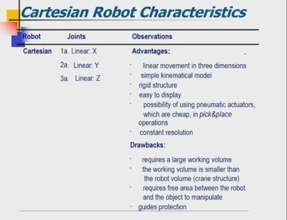 A manipulator consists of joints and links. Joints provide relative motion. Links are rigid members between joints. There are various joint types, linear (P) and rotary (R). Each joint provides a "degree of freedom". Most robots possess five or six degrees of freedom
