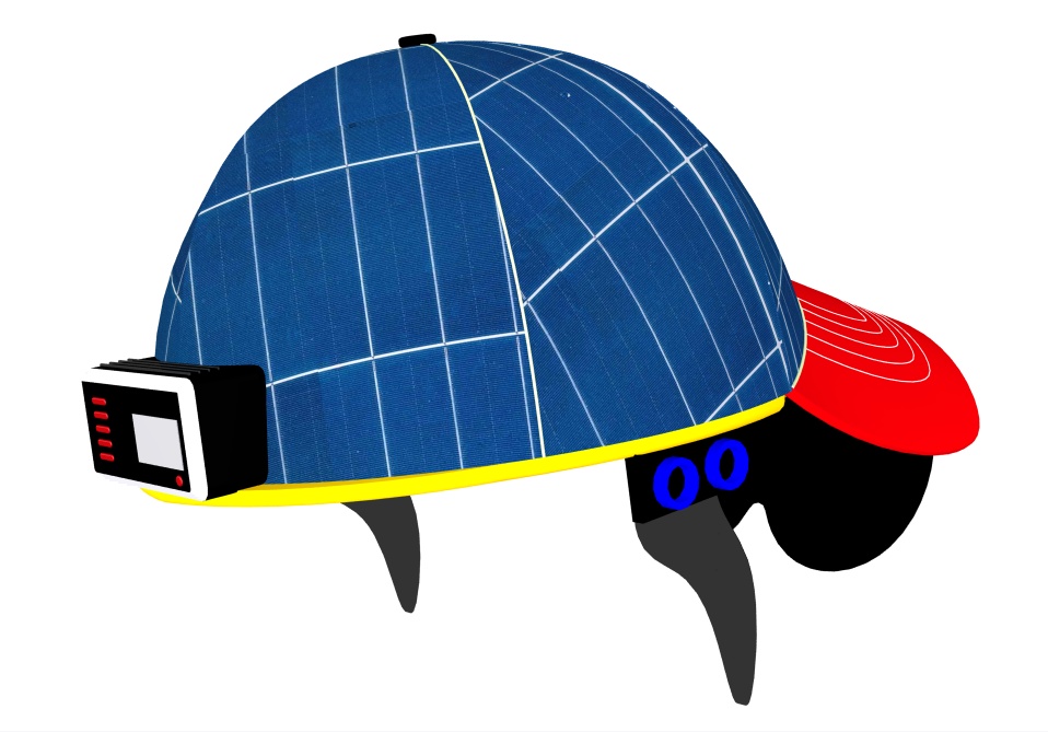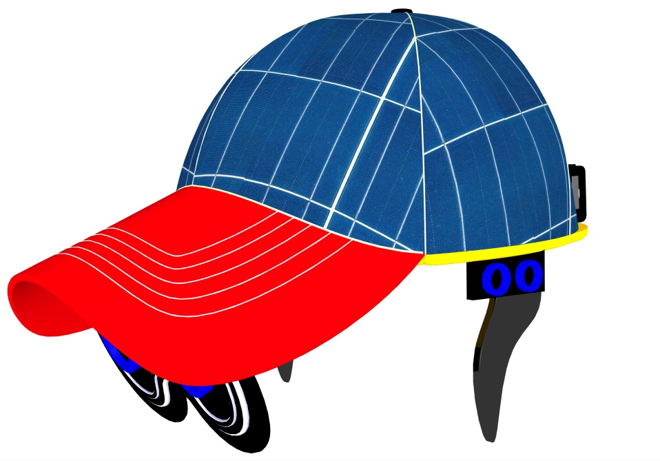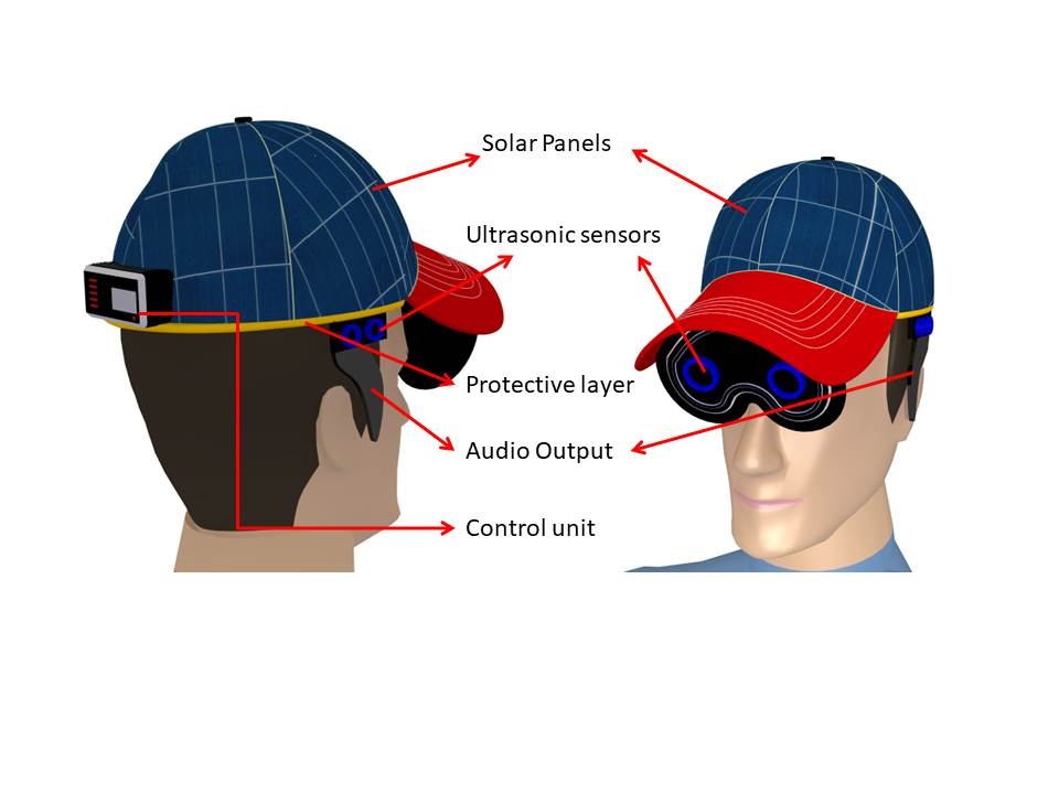 This hat has eye-shaped glass which is equipped with an ultrasonic sensor. The sensors are available even on the sides . Flexible solar cells are fixed at the top of the hat that continuously powers the battery which is equipped behind . There is a layer which separates solar cells from the person to provide a comfortable zone in between. Vibration sensors are fixed around the ends of the HAT which provides mild vibration to the person during the detection of the obstacle.