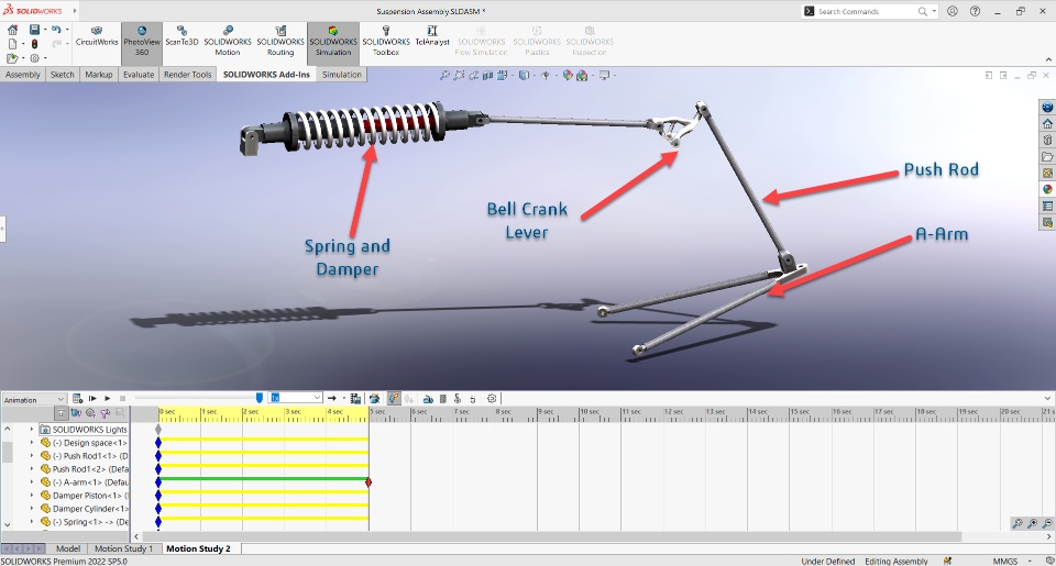 This SOLID Saturday we have suspension system mechanism animation here. Previously we have seen the optimization of the bell crank lever with functional generative design. This time I've created the motion of the Suspension damper with functional spring. This can be done using the inter component references as I did for the spring. This mechanism is used widely in the vehicles in which the A-Arm is used to connect the suspension push rod and the upright. Then the load is transferred from the A-Arm to bell crank and then to the damper by changing the direction of the force.