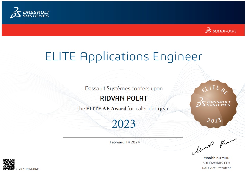 I met SOLIDWORKS when I was a student in high school. I received my first CSWA certificate in 2020 sponsored by TEKYAZ. I received my CSWE certificate in 2021 sponsored by 3DEXPERIENCE World. Now I received the Elite Application Engineer award, the highest level award that an engineer working in reseller can receive.