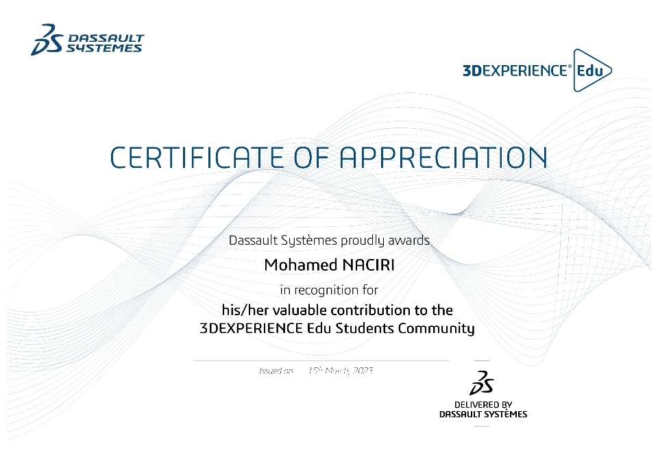 And Thank you very much 3DEXPERIENCE edu, @SA and Dassulat systemes, for this gift and this certificate, and i eagerly await that general gathering of all Students champion around the world in order to exchange information and experiences among students in the field of 3d design.