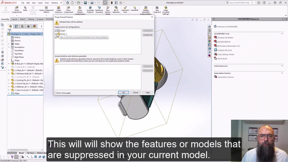 After working for a long time on a part or an assembly you might have several configurations and several components or features that are suppressed.