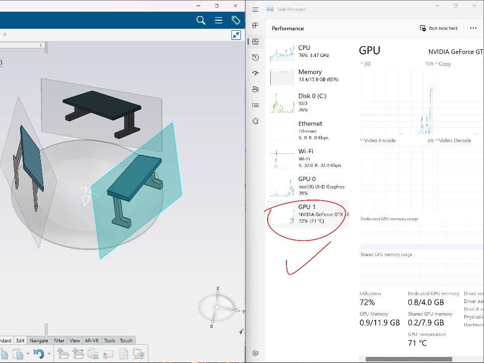 Hello everyone, I'd like to give a tip on how to improve frame rate and visual performance for 3DExperience. If your frame rate is low, go to the Task Manager in Windows and check if your laptop's external graphics card is used. If it is not and only the integrated graphics is utilized, then it will be slow. For higher performance, you must ensure that the external card is always used whenever 3DX is running.