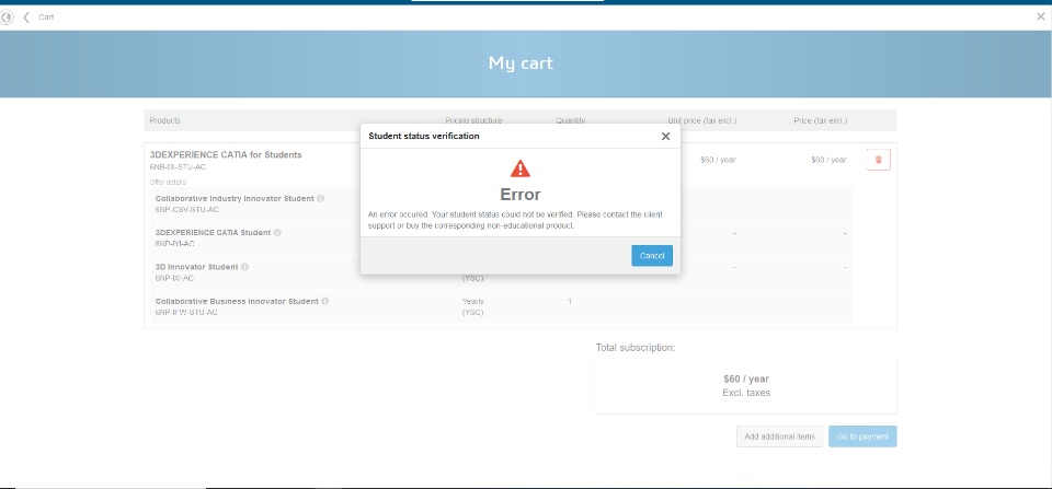 I'm a student at Embry-Riddle. I've been able to purchase CATIA Student Version in the past but all of sudden I'm met with this error message. I already tried emailing them about the issue but have not gotten a response. Can someone just verify my student status please?
