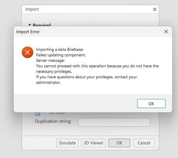 I have just started learning Catia. As I tried to import a 3DXML file from 3DExperienceEdu, I got the following error, which for me doesn't make sense since I have the administrator role.