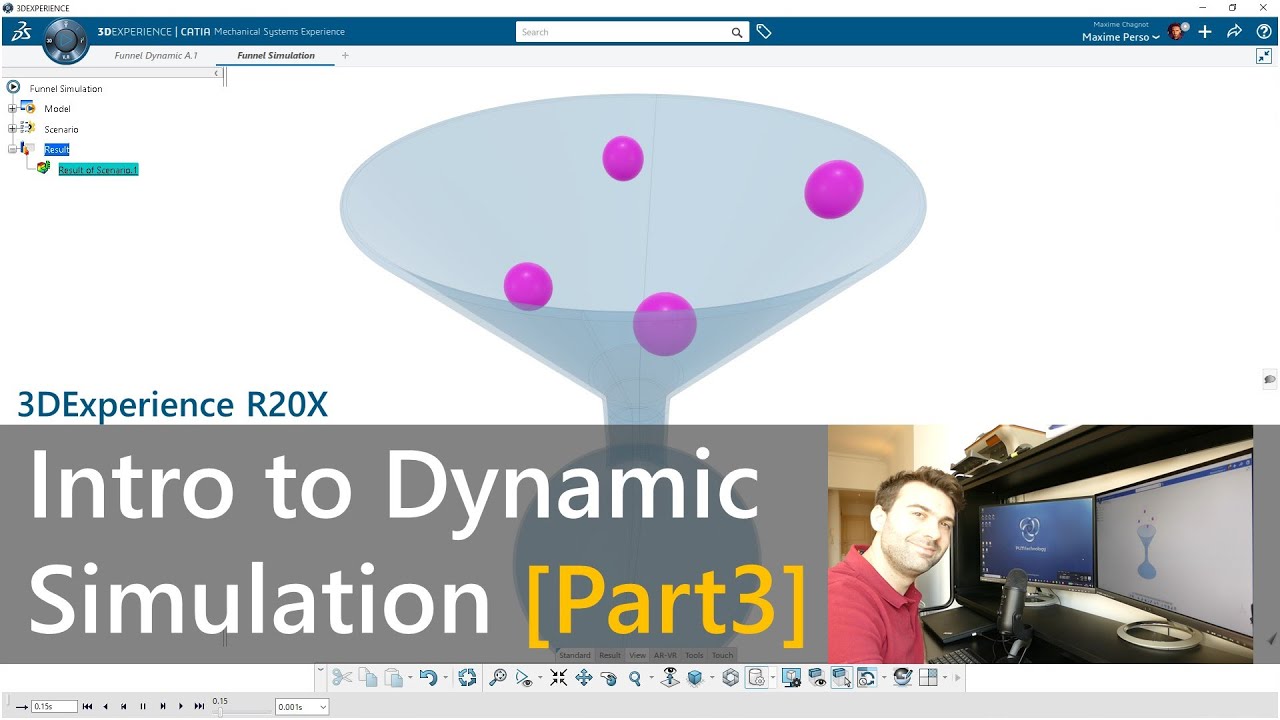 In the third part of his Introduction to Dynamic Simulation on CATIA 3DEXPERIENCE tutorial series, Maxime Chagnot talks about groups of contact between several parts. He uses the scenario of 4 balls falling into a funnel to show the concept of group contacts. You’ll learn how to create contacts between the balls and the funnel, as well as between each ball, and add friction and restitution coefficients. You’ll create a dynamic scenario in Mechanical Systems Experience, try different diameter sizes of the funnel hole, and study the behavior of the falling balls.
