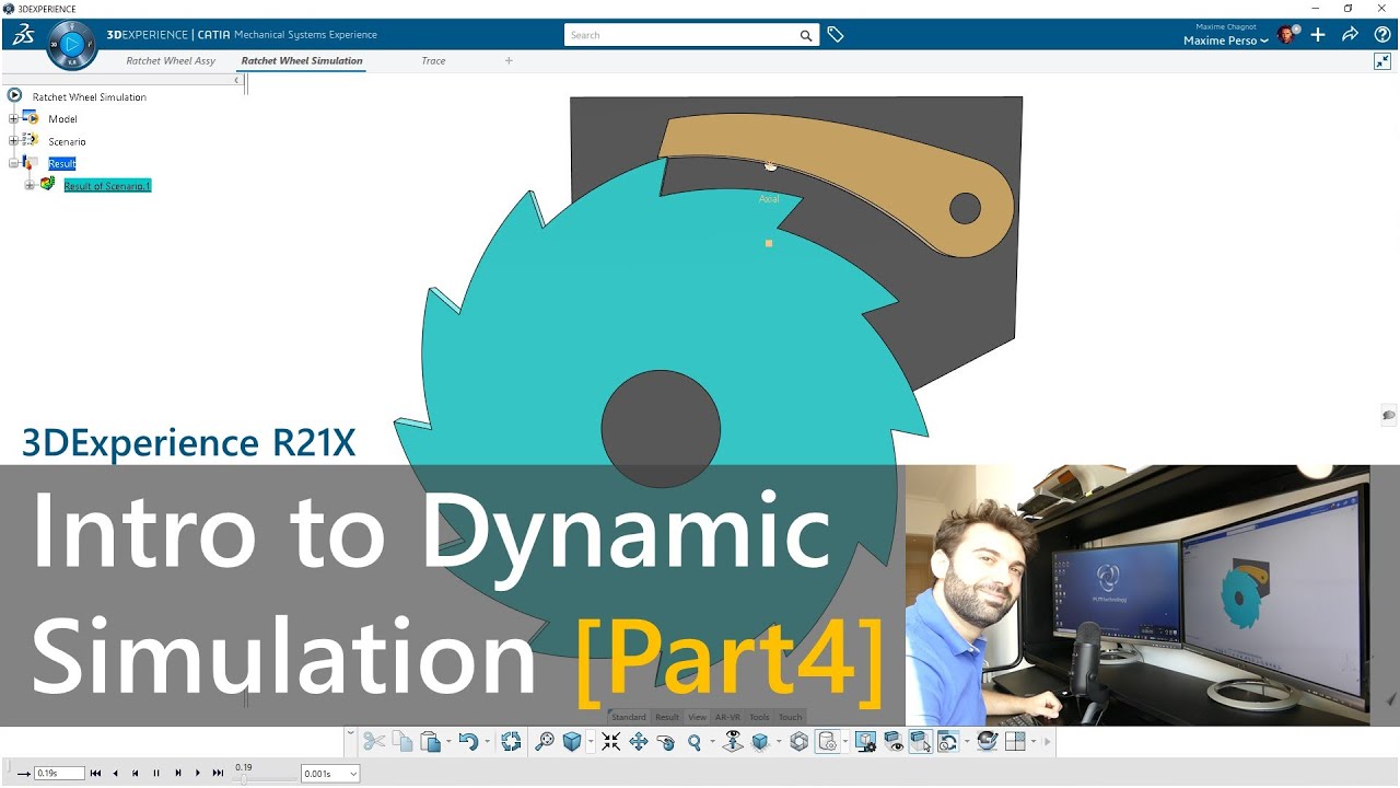 In this fourth part of the tutorial series on Dynamic Simulation on CATIA 3DEXPERIENCE, Maxim Chagnot explains the concept of Axial Spring in Mechanism Systems Experience. He uses the example of a Ratchet Wheel and a pawl to illustrate the importance of the spring. The tutorial covers the creation of engineering connections, contacts, and a spring, followed by the creation of a Dynamic scenario using a motor excitation on the Ratchet Wheel to study the motion of the Pawl. Finally, he demonstrates how to extract the traces of the pawl and replace the motor with a position motor to rotate the wheel in both directions. This video will be helpful for anyone interested in learning more about 3DEXPERIENCE.