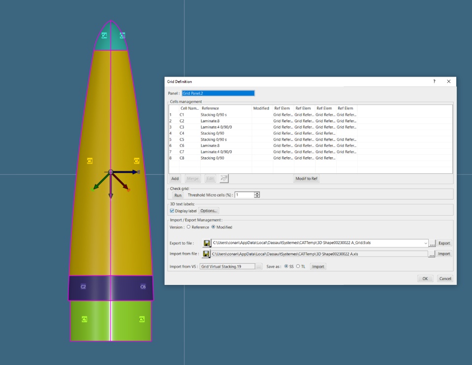To start, we will generate groups of plies based on the previously created grids. This will allow us to reinforce or create a ply that can be handled more carefully. For instance, we need to place a ply from the sleeve of the nose cone to the tip as a first layer. However, layering the entire section at once will result in lousy control during the layering process. Therefore, we divide this into smaller pieces. With the grids created, we can now define the layer thickness at each grid to create reinforcements where needed. As you can see in the attached photo 1, not every grid has the same amount of plies. For example, grids C4 and C8 have more plies than grids C1 and C5.