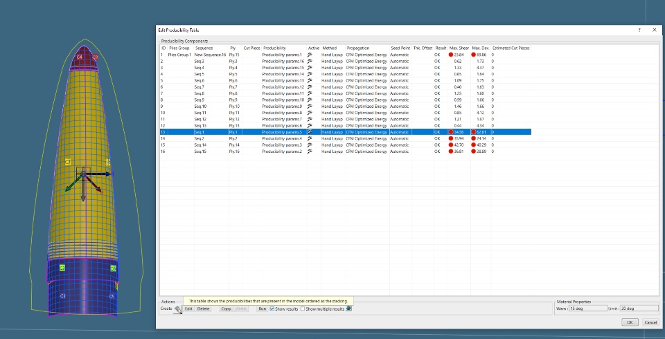 The first photo attached shows how I analysed the ply's layup at the tip of the nose cone. The second photo attached shows how it analysed all sixteen plies created to determine which ones can be layered and which need more attention. As predicted, the tip section of the nose cone is difficult to layer; although we have defined it as a separate ply, the same accounts for the full ply, which covers the whole nose cone. Based on the specific parameters I entered about the carbon fibre role, it will warn you of possible locations where layering will not work out. I am happy with the result I have achieved here since it is just a showcase, but I would normally refine the grids based on the warnings I receive to make it more optimal for layup.