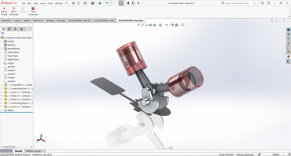 The piston system is designed accordance to the working principle of real V-cylinder engine piston system