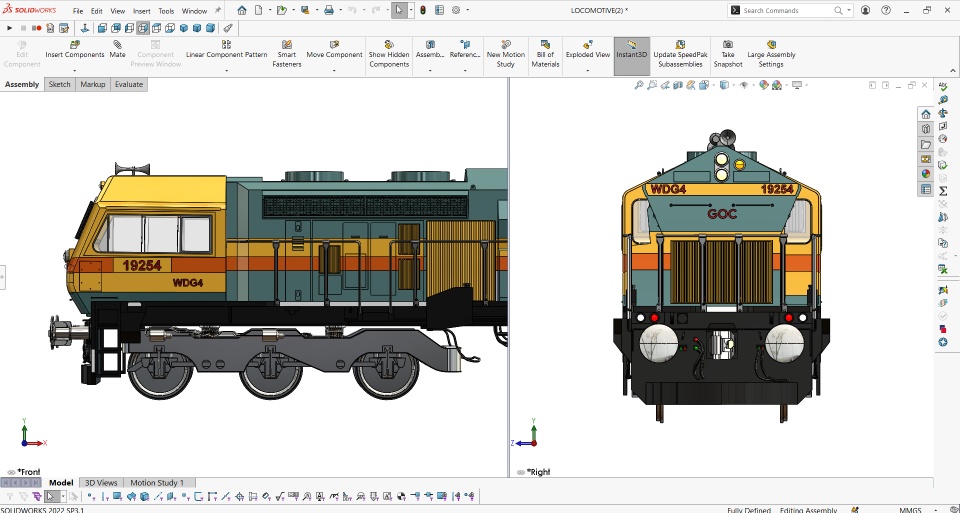 To demonstrate my deep passion for Indian Railways, I have designed and rendered WDG-4, a freight-hauling diesel-electric locomotive with AC electric transmission designed by General Motors Electro-Motive Diesel in 1997–1998 for Indian Railways, where they are classed as WDG-4. Designed in SOLIDWORKS and rendered in SOLIDWORKS Visualize. I used the images I had captured during each journey on the train. From those, I approximated the values for the design. I know this is a vast process to reach the accuracy of the ratio of each part. But my passion for the Railways made me design it for sure. I designed this in 2022, and this also got featured on Dassault Systèmes official Instagram and Twitter handles. I'm working on the tutorial part to make all my peers understand the process in detail. Find the links below to view the posts.