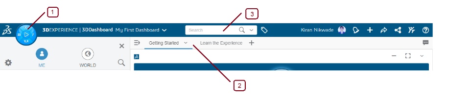 Search: Lets you search across the 3DEXPERIENCE platform or within the current tab. Search results can be refined using 6WTags.