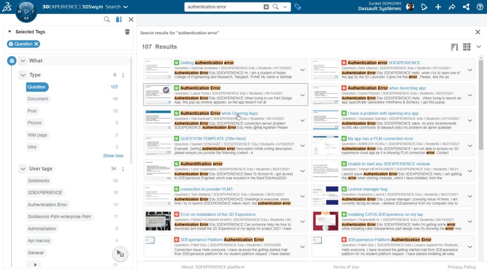 You can easily navigate to the topic of your interest in the 3DEXPERIENCE SWYM platform, by first searching your query using 3DSEARCH and then filtering the contents using 6W TAGS.
