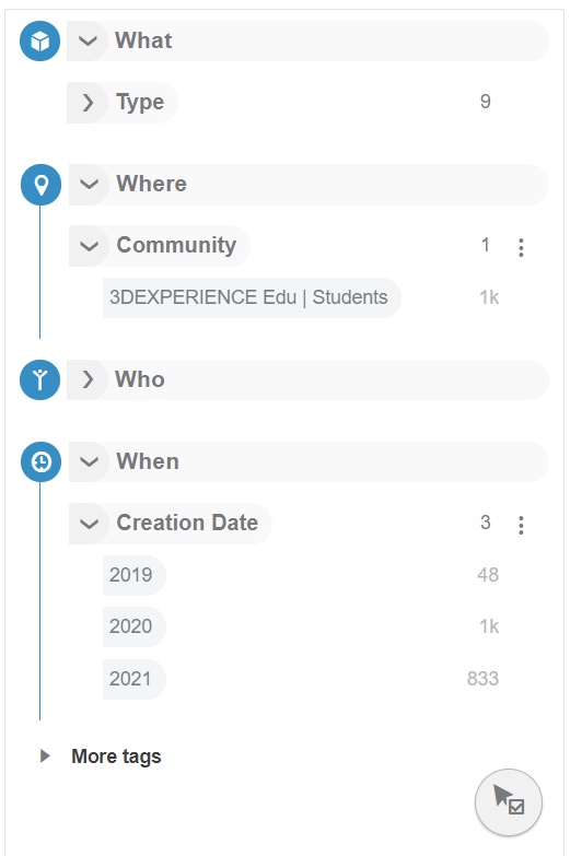 You can easily navigate to the topic of your interest in the 3DEXPERIENCE SWYM platform, by first searching your query using 3DSEARCH and then filtering the contents using 6W TAGS.