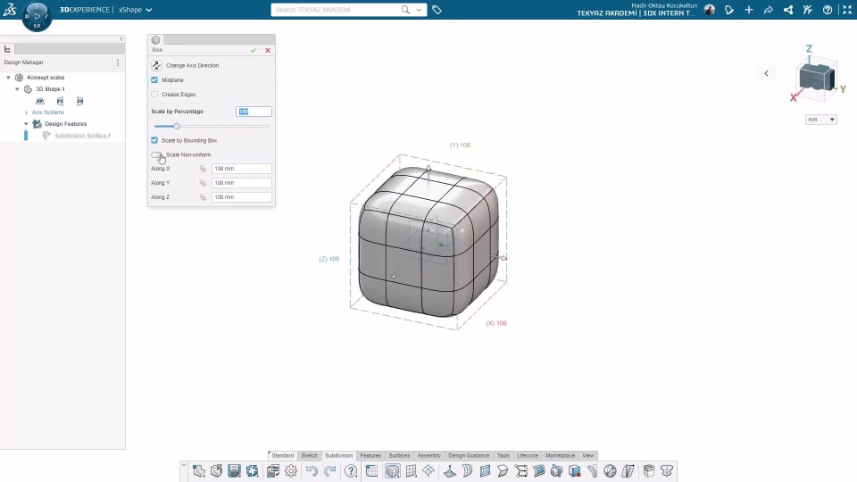 After selecting our box, we adjust our geometry from the section in the upper left corner. In order to make our origin the center of our geometry, we press the mid plane, and you can use your geometry as angular with the tab under it. Scale section sets the size of our geometry. The boxes on our geometric shape indicate the number of edges as the axis, if we increase this number, we can make more detailed models, but the surface integrity is quickly broken. With the bounding box, we can enlarge it by giving the measurements on the 3 axes, namely the x, y and z axes. If the (scale non uniform) is on, it allows us to measure without changing the ratio of the axes of our model to each other.