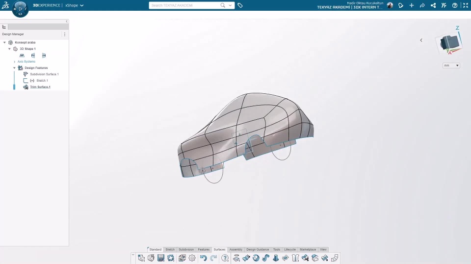 As you can see in the previous video, we made our model a surface. What we need to pay attention to here is that if we have brought our model to surface form, we can now use only surface commands for our model, as in the example here, I used surface trimming for the wheel housing. In solid form, we use the parametric modeling commands we know. This is the difference between the two as you can see here.