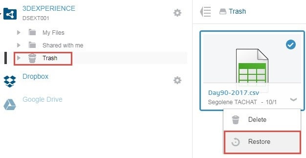 This folder can be retrieved in the 3DDrive web application. The user can then either delete permanently a content or restore it.