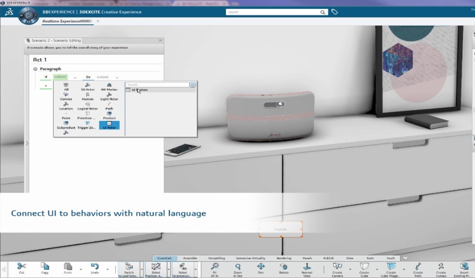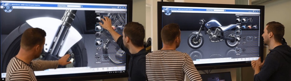 Product Experience Presenter helps creative designers to explore in 3D many design variants and combinations. It allows creative teams to brainstorm together, live in 3D, on multiple design possibilities. Full integration with the design data and high quality and accurate visualization leads to improved communications and better decisions across all disciplines. The presenter can leverage touch-screens for effective presentation, and, with the Immersive Visual Experience role, VR is available.