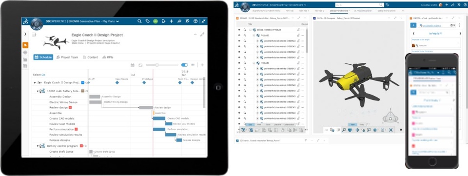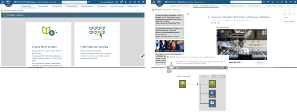 - Create a requirement in ENOVIA, or publish content in SWYM or 3DDRIVE directly from a NETVIBES web monitoring app. This aims to connect market intelligence to product development and fluidify the social ideation process.