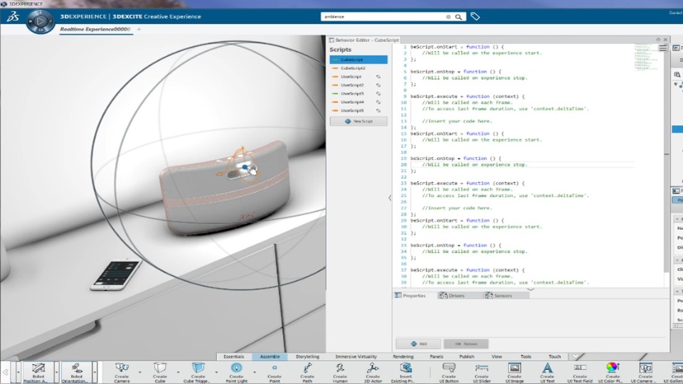 The user can quickly and simply set up a design review experience with styling variants, packaging options, animations, views and configurations. The presentation can be enriched with ambiences, environments, lighting and behaviors.