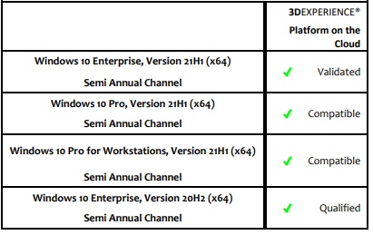 Currently, only two versions i.e. Windows 10 Version 21H1 and Windows 10 Version 20H2 are considered supported. The older version 1909 is no longer supported for the 3DEXPERIENCE platform On Cloud.