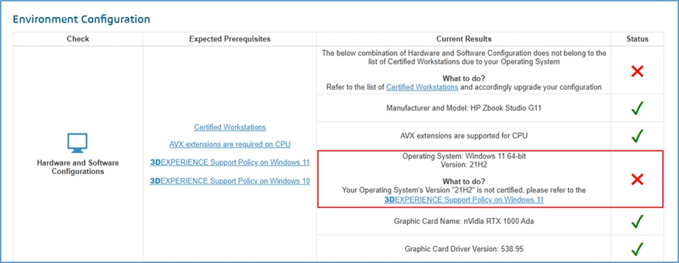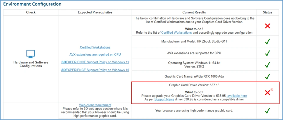 In recent times, multiple workstations has been certified by the Dassault Systèmes for supporting the 3DEXPERIENCE Platform on the Cloud. All of these workstations are updated into Certified Workstations List for 3DEXPERIENCE Platform on the Cloud and the Cloud Eligibility Checker tool does take this changes into account in Hardware and Software Configurations check as per below: