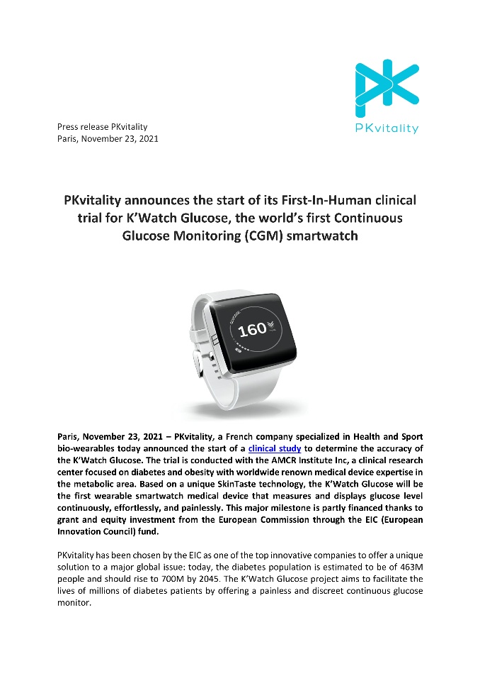 The PKvitality team is proud to announce the start of the first clinical trials for K’Watch Glucose, the first smartwatch that measures glucose level continuously, effortlessly, and painlessly. This is a major milestone for our company that will confirm the accuracy and the patient-friendly experience of our product.
