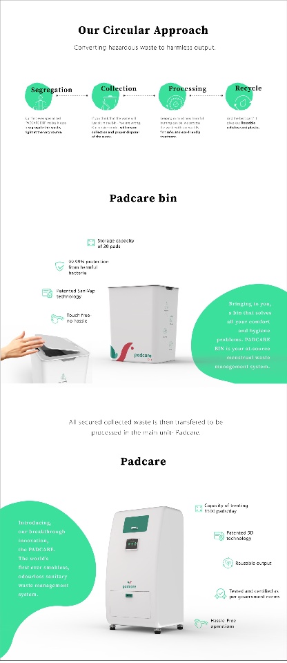 In India 🇮🇳, the impact of disposing of 12.3 billion sanitary napkins annually is more pronounced because of the unorganised ways of municipal solid waste management and poor community collection, disposal, and transportation networks in the semi-urban areas and villages. PadCare Labs’ mission is to make modern sanitation choices safer and recyclable for women across the world and encourage inclusiveness, equality, and healthier practices in public hygiene. Their patent pending 5D technology is instant, odourless, and colourless in operation unlike traditional incinerators. The company offers a four-stage cycle of segregation at source, collection, processing and recycling of the waste.