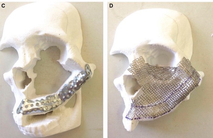 Reconstruction of Maxillary and Orbital Floor Defect With Free Fibula Flap C&D: Reconstruction on mock model using fibula bone grafts and titanium mesh