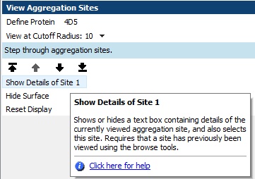 After running the Calculate Aggregation Scores protocol, use ViewResults to open the result in the molecule window. Then use the View Aggregation Sites tool to step through and analyze the predicted aggregation sites.