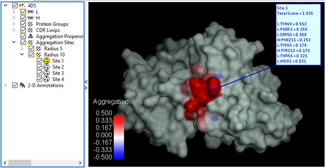 The Calculate Aggregation Scores protocol predicts protein surface sites which are prone to aggregation. It is based on the spatial aggregation propensity (SAP) method to identify patches of exposed hydrophobic residues on the protein surface. The residues in these sites would be candidates as mutation targets to increase protein stability.