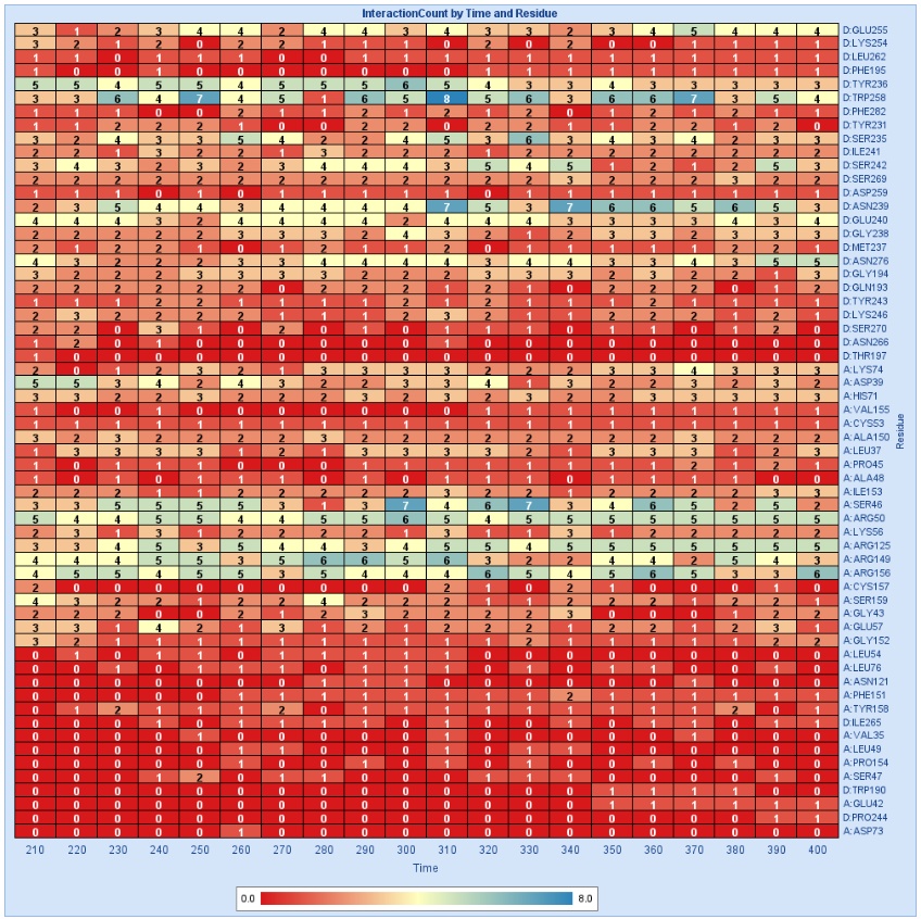 This protocol creates a Heat Map showing the number of interactions involving interfacing residues over a trajectory. The protocol parameters are the same as those in the Analyze Protein Interface protocol. The output is the Heat map plot (similar to the one shown below) in the job Report and a csv file containing the same data. Beware of using a trajectory with too many conformations otherwise the Heatmap will just a black box. The one below contains data for 20 conformations.