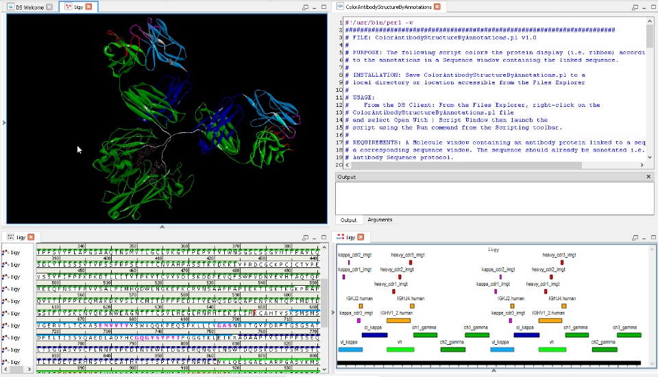 From the DS Client Files Explorer, right-click on the ColorAntibodyStructureByAnnotations.pl file and select Open With | Script Window then launch the script using the Run command from the Scripting toolbar.