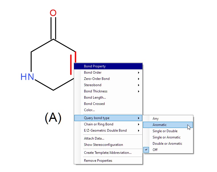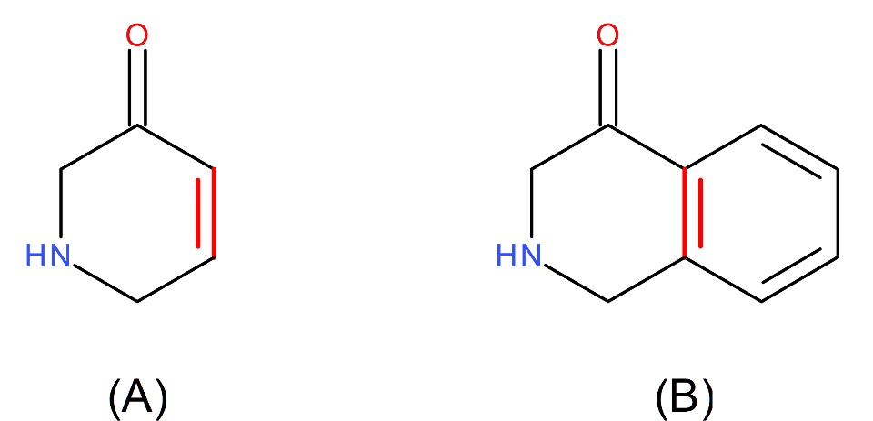 These two molecules however do NOT match in a substructure search or in the Substructure Map component, and this is due to the nature of the double bond marked in red in the two molecules. The double bond in molecule (A) is a bare, non-aromatic double bond, whereas the same bond in molecule (B) is an aromatic double bond.