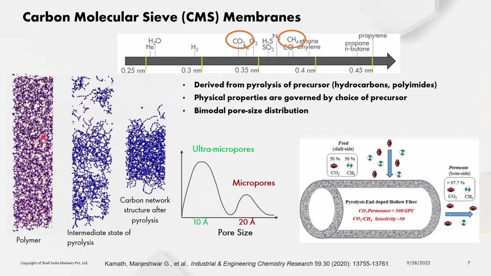 With the increasing demand for developing alternative technologies for carbon capture, polymeric membranes have been widely researched as potential CO2 separation and capture media. 6FDA/BPDA-DAM is an excellent precursor polymer for creating high-quality carbon molecular sieve membranes through pyrolysis. The polymer and the derived carbon molecular sieve membranes have shown excellent selectivity and solubility towards CO2 gas molecules due to a distribution of ultra-micropores and micro-pores. We have exploited molecular dynamics simulations to develop a molecular model for CMS membrane to understand better the statistics and the structure of the pores in a melt. Also, the use of a combination of grand canonical Monte Carlo (GCMC) and isothermal isobaric (NPT) molecular dynamics simulations to obtain the CO2 adsorption isotherm of the polymer matrix, including matrix swelling effects. 2022 BIOVIA Conference