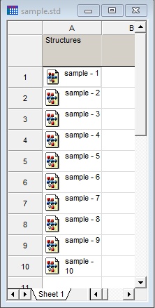 The trajectory document, sample.xtd, contains all the 10 structures from the sample.sdf file. One may separate the structures into individual cells in a study table, using the “Insert From File” utility to insert sample.xtd, resulting in a study table similar to the following: