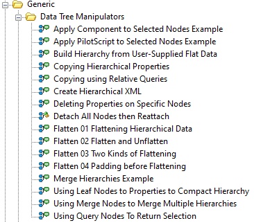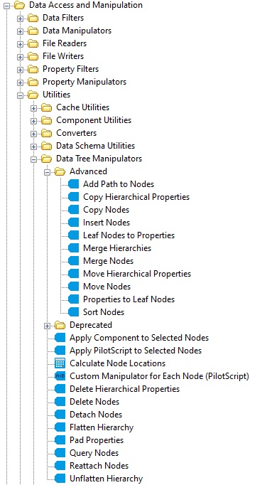 Manipulating hierarchies is also easy using the specialized PilotScript functions or the provided components. Nodes can be detached from their parent and output as their own data record, moved elsewhere in the hierarchy or deleted. They can also be detached, manipulated in some way, and then easily reattached in the same place in the parent hierarchy. Multiple data records with different hierarchies can be merged together. Hierarchies can be flattened into a one-level data record to help with visualization. And finally, hierarchies can be converted to JSON or XML to be used elsewhere.