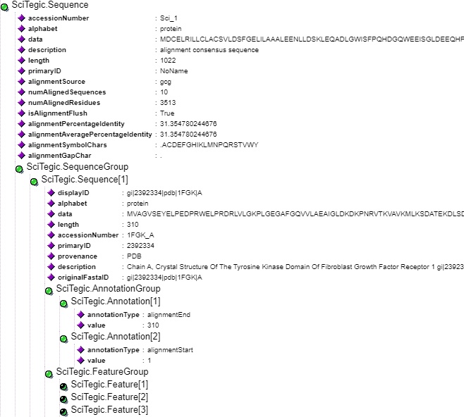 However, there are cases when the data is more complex than that, and a simple one-level flat data model is not sufficient to hold all the information in the input. In these cases, Pipeline Pilot uses a hierarchy, with a root node at the top with properties associated with it just like in the flat example described above, and additional child nodes attached to that root node in a multi-level data model. This representation is critical when working with more complex data, and Pipeline Pilot provides multiple ways in creating, manipulating and visualizing this data. An example of hierarchical data record is shown below (as above, green balls represent nodes, purple diamonds are properties):