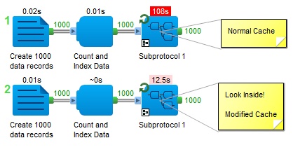 In the example enclosed, I make use of the hidden parameter CacheCategory existing on the cache component. When this parameter is configured to point to \\\$(LocalJobTempDirectory) and the CacheID Scope is Cache Category, the cache component will make use of the implementation and the information will be stored locally on the execution server, saving the overhead time involved in the use of NFS.