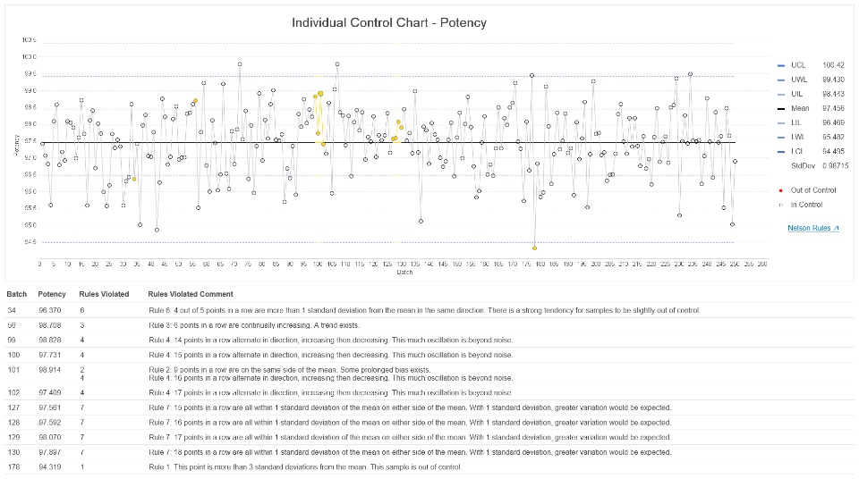 - Nelson Rules Filter example: This example protocol generates 100 batch potency values at random, following a normal distribution. The Nelson Rules Filter is used here to determine whether potency is out of control (unpredictable versus consistent).