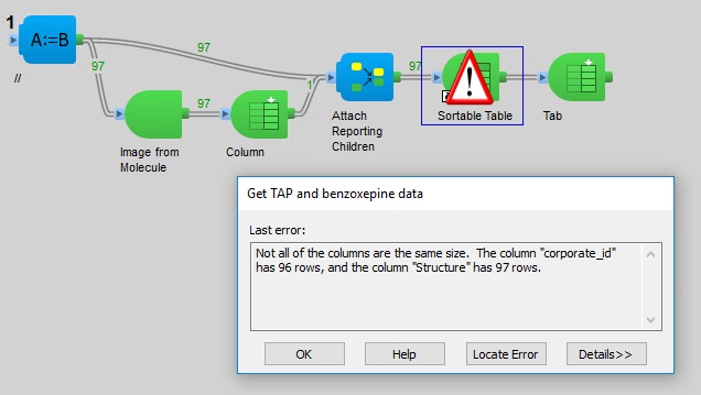 Does anyone have a solution for generating a sortable molecular table reporting object? I tried piping in the structures onto the data using Attach Reporting Children, but the Sortable Table component complains that it's getting different numbers of records (which it isn't).