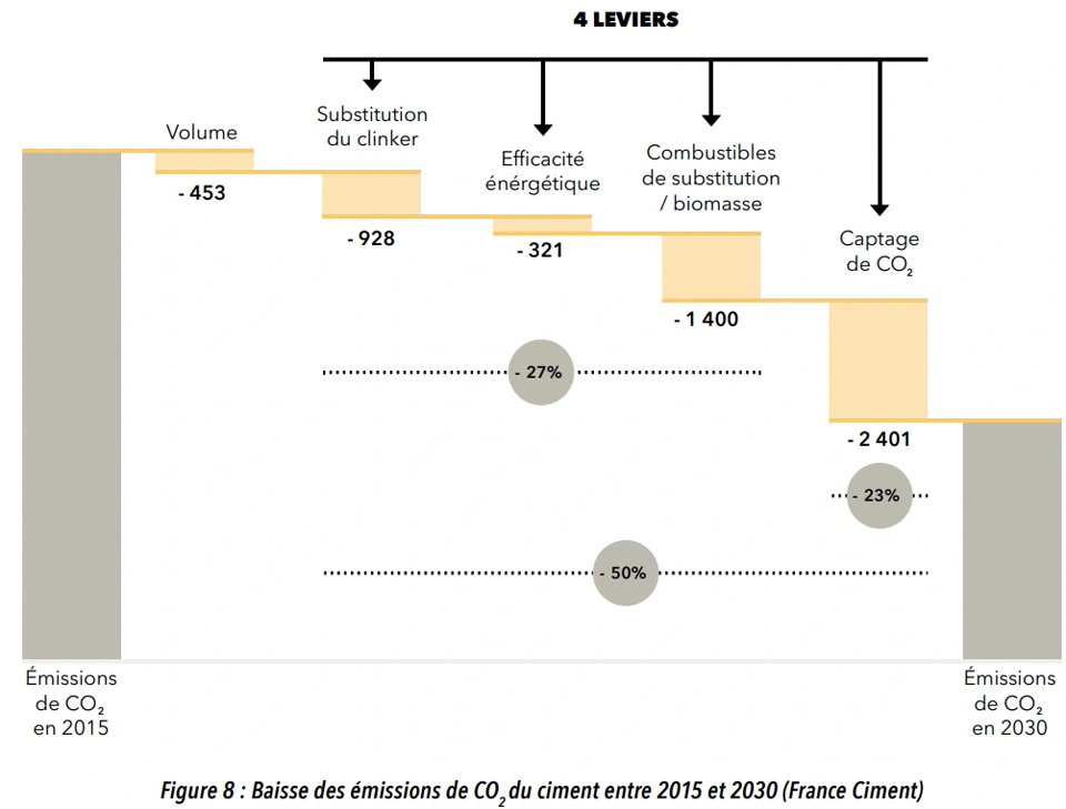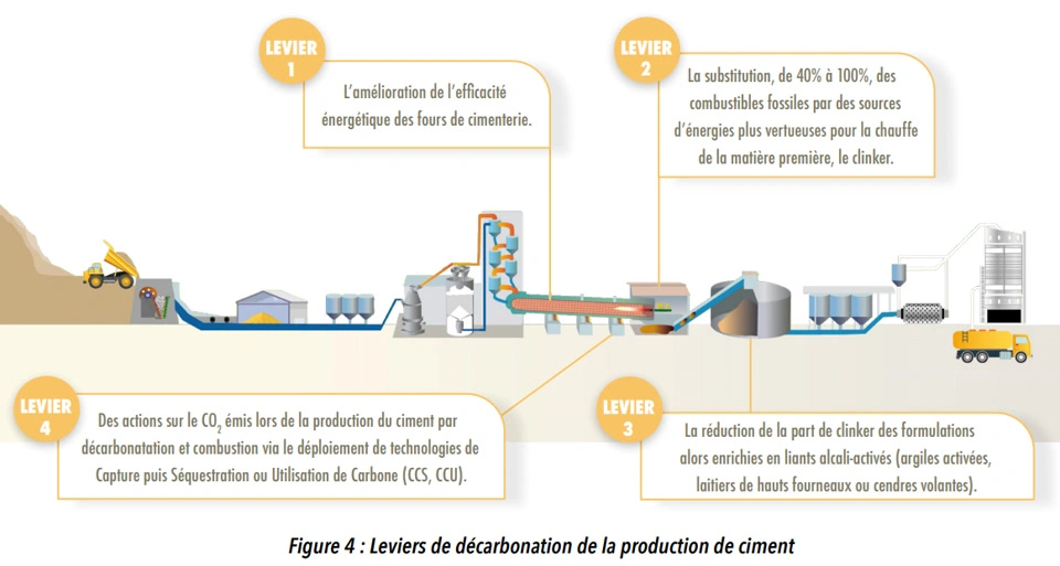 Pour décarboner la production de ciment, le secteur a déjà commencé à agir sur 4 principaux leviers :