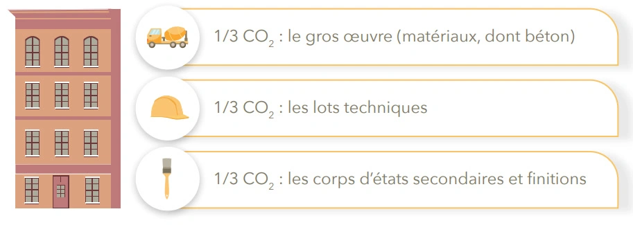 Dans le cas d’un bâtiment résidentiel collectif classique, sur l’ensemble de son cycle de vie, le bilan CO2 total se répartit ainsi :