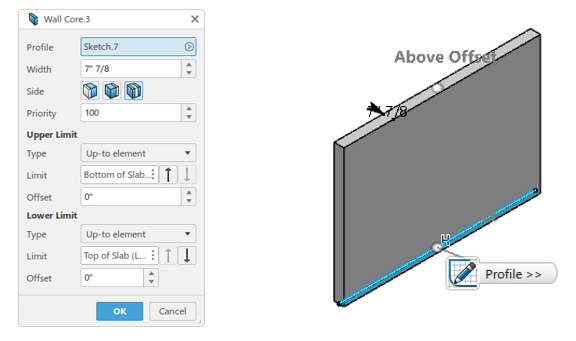 The new wall and slab features are both based on volumetric geometry, similar to what you would find in the volume tab of the Building 3D Design application. The wall can take either a centerline or volume as input, then has a number of parameters available to position the wall. Take a look at the priority parameter - with this value you can control how the intersections of walls are managed at wall corners.