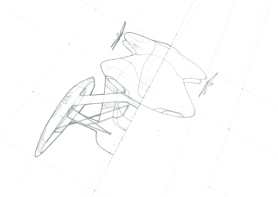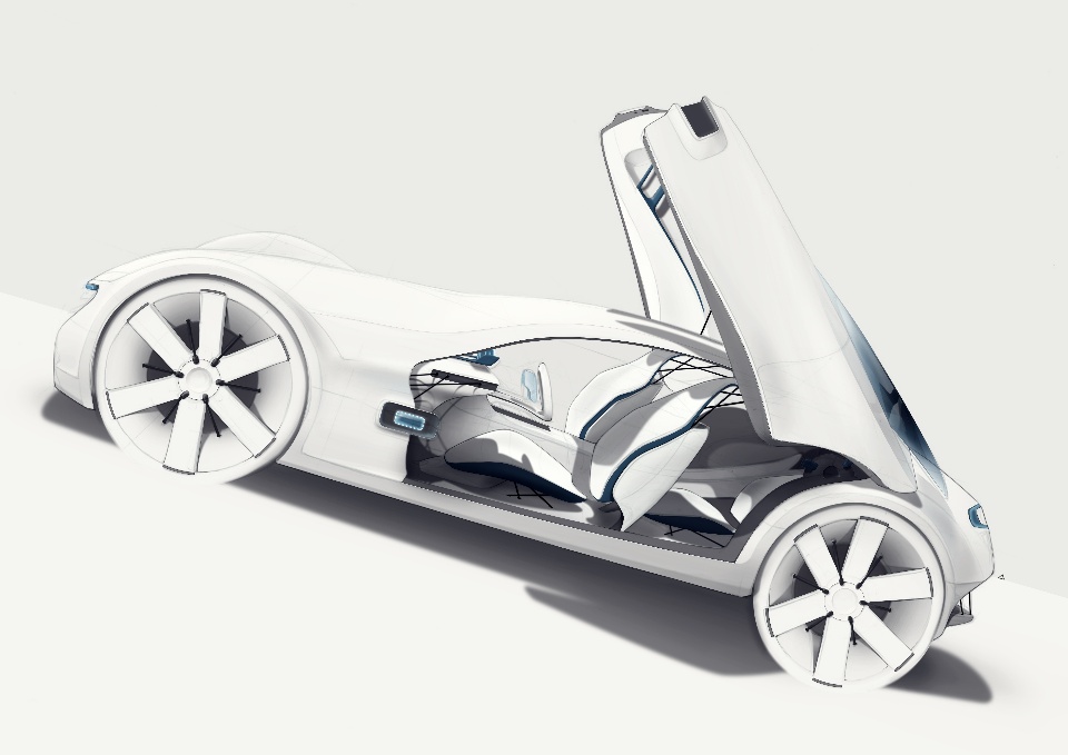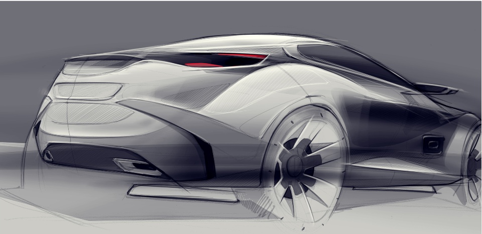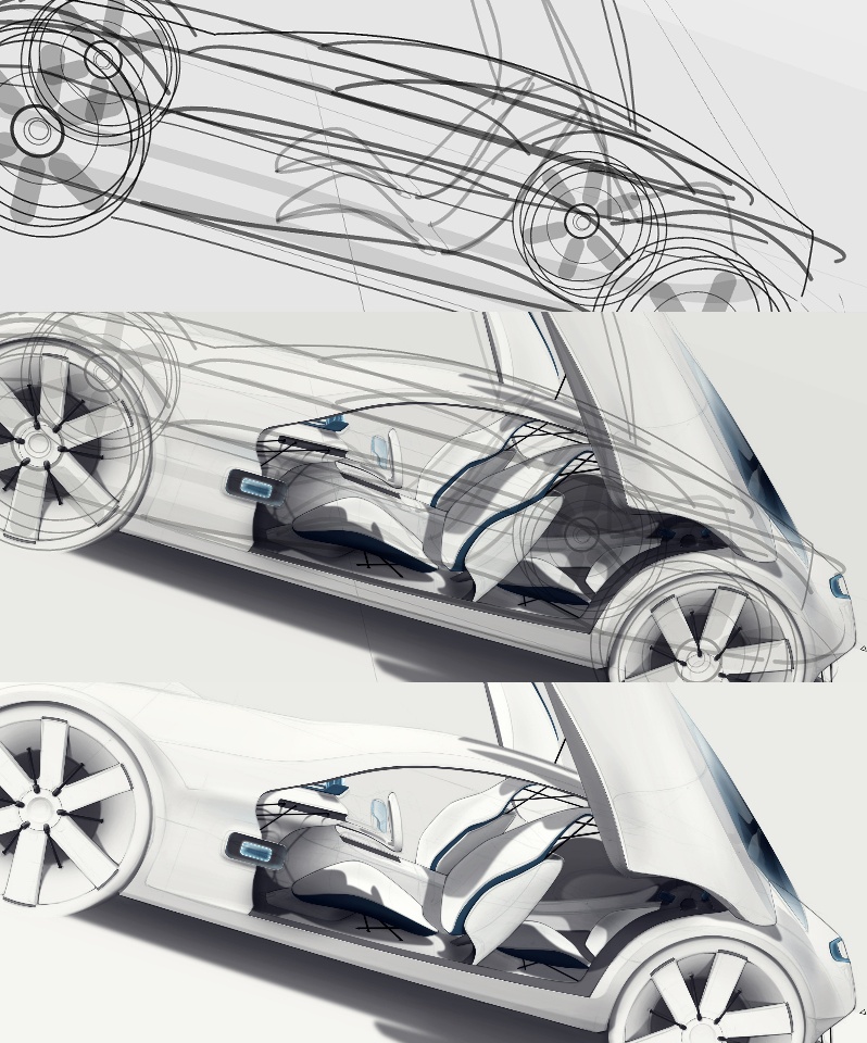 Based on that, starting to explore with abstract inspiration sketch, speedforms closer to spaceship than realistic cars with 4 wheels:
