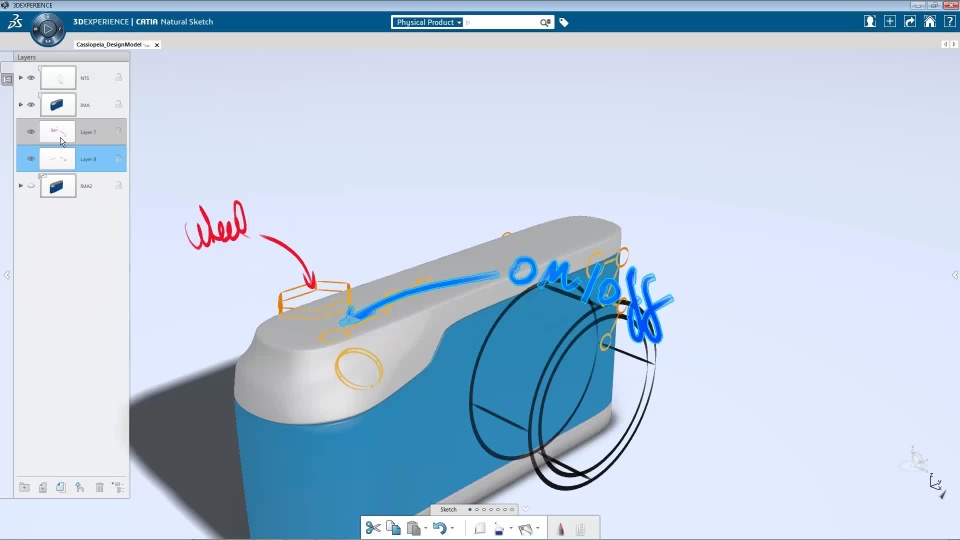 Creative designer can also use CATIA Natural Sketch to annotate using Layers: