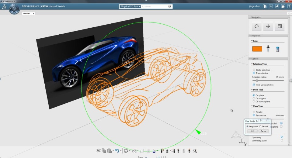 Then we switch to 3DEXPERIENCE Platform, drag & drop the side view inside, to make sure the car has right size and proportion (picture 1), then we use Natural Sketch to quick sketch the main styling curves and details of the car.