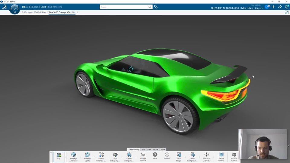 During the displayed workflow I use the Applications Natural Sketch for 3D Sketching, Imagine&Shape for Subdivision Surface modelling, Live Rendering for visualization, Human Design for Product exploration, VR for immersive design reviews, CATIA Icem for Class A modelling and Product Perception Experience for the model presentation - all on the 3DExperience Platform in a holistic Design Workflow.