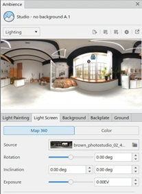 For the lighting, I am using a custom ambience, based on an HDRi, but with a solid gray color assigned to the background. Creation of the ambience object is straightforward. Create a new ambience, which will bring you to the Ambience Studio app. Assign the HDRi in the Light Screen tab, then switch to the Background, select Color instead of Map 360 and choose a dark gray.