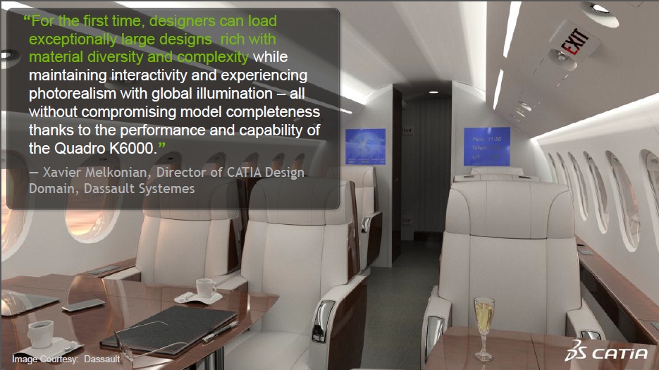 Did you remember CATIA at the SIGGRAPH International Conference and Exhibition on Computer Graphics in Anaheim, California presented last week in our blog? The news today is that NVIDIA unveiled The NVIDIA Quadro K6000 what it is calling a new flagship GPU (graphics processing unit) for visual computing. The gadget will dramatically improve real-time photorealistic visualization, analysis, and animation. And guess which image illustrate advanced product design visualization? The interior of the airplane Loftjet :) Thanks Cadalyst redaction team. For more details here. |